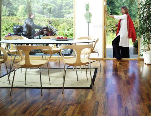 Массивная доска - это цельная (неклееная) доска из массива дерева. (Не путать с паркетной доской конструкцией из трех слоев, жестко склеенных друг с другом). Она отличается от своих прежних аналогов качеством сушки древесины, изготовления и тем, что ее теперь делают в основном из древесины ценных пород. Кроме того, она имеет теперь по краям пазы и гребни (так же как паркет и паркетная доска). Это позволяет плотно стыковать половицы. Иными словами, современная массивная доска это возврат к старому деревянному полу, но на новой технологической основе. Природа обеспечила этот материал целым рядом достоинств. Дерево прекрасный теплоизолятор, имеет небольшой вес, обладает высокой прочностью, упругостью. Благодаря плотности материал способен удерживать металлические крепления. Перечисленные свойства различны не только у разных пород дерева, но могут значительно отличаться в рамках одной породы и даже одного дерева. Вообще наиболее устойчивыми к перепадам температуры и влажности считаются породы древесины, содержащие природные масла: тик, мербау, дуб, дуссия, кемпас, кумару, лапачо. А к числу “капризных” принадлежат большинство светлых пород древесины и фруктовые породы дерева (вишня, черешня, груша). Тем, кто выбирает массивную доску из “капризных” пород дерева, надо строго контролировать влажность воздуха в помещении (желательно поддерживать ее на уровне 40-50%) и не усердствовать с обогревателями. По размерам массивная доска бывает разной: в длину от 0,5 до 3 метров, в ширину от 10 до 20 см. Что касается толщины, то и в данном случае нет жестких стандартов, но самой ходовой считается 18, 20 или 22 мм. Толщина доски напрямую связана с ее механической прочностью. Массивная доска должна укладываться в помещениях, отвечающих техническим требованиям для настила покрытий из натуральной древесины. Ей надо пройти акклиматизацию в том помещении, где будет монтироваться, в течение минимум трех суток. Влажность древесины должна составлять 8-10%. Напольные покрытия укладываются на завершающем этапе ремонта, когда уже установлены окна и дверные коробки, выровнены и как следует просушены потолки, стены и, конечно, стяжка. Должна быть завершена укладка керамической плитки, так как это мокрый процесс. Для придания идеальной ровности рекомендуют проводить шлифовку доски. Затем, если в заводских условиях, еще при производстве, не нанесено какое-либо покрытие, ее покрывают по желанию тонирующим составом, лаком. А в последнее время с модой на все натуральное и старинное стали применять масло и воск. У такой доски есть ряд преимуществ, в первую очередь, с точки зрения экологии, особенно если в доме есть аллергики. Даже на идеально уложенной массивной доске высокого качества со временем все равно появятся щели. Это результат естественного движения древесины. Специалисты считают, что в этом нет ничего страшного. Ведь именно в этом и заключается эстетика массивной доски. Немцы, например, считают, что появление щелей неотъемлемая часть хорошего натурального пола. В России же к этому явлению пока относятся более настороженно. И хотя избежать появления щелей практически невозможно, нужно хотя бы знать, что в нашем климате, особенно зимой, условия для древесины создаются просто критические. В квартирах вовсю работают батареи отопления, в окнах стоят герметически